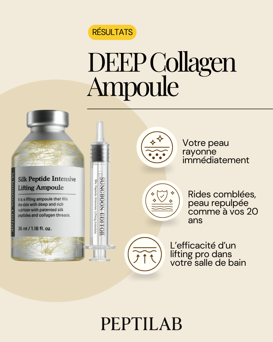 C’est un soin innovant anti-âge qui hydrate profondément, repulpe la peau et illumine le teint dès les premières utilisations. Sa formule unique associe collagène et files de peptides de soie pour un effet lifting naturel, sans aiguille ni douleur.