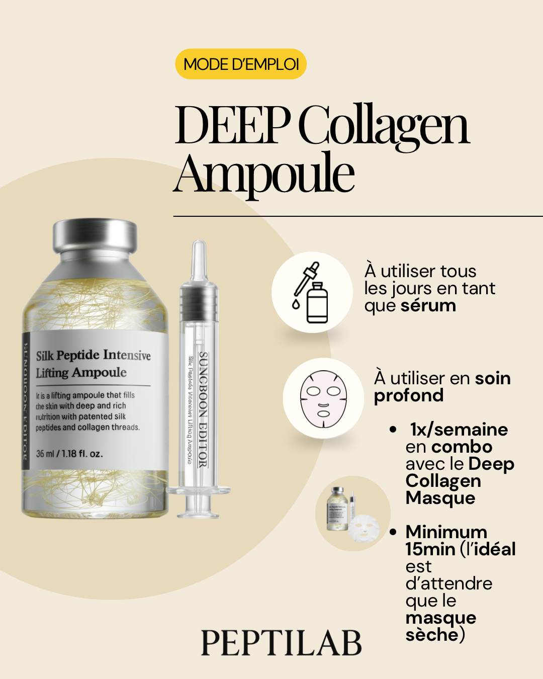 Deep Ampoule Collagen s’utilise quotidiennement comme un sérum, en petite quantité pour tout le visage.
